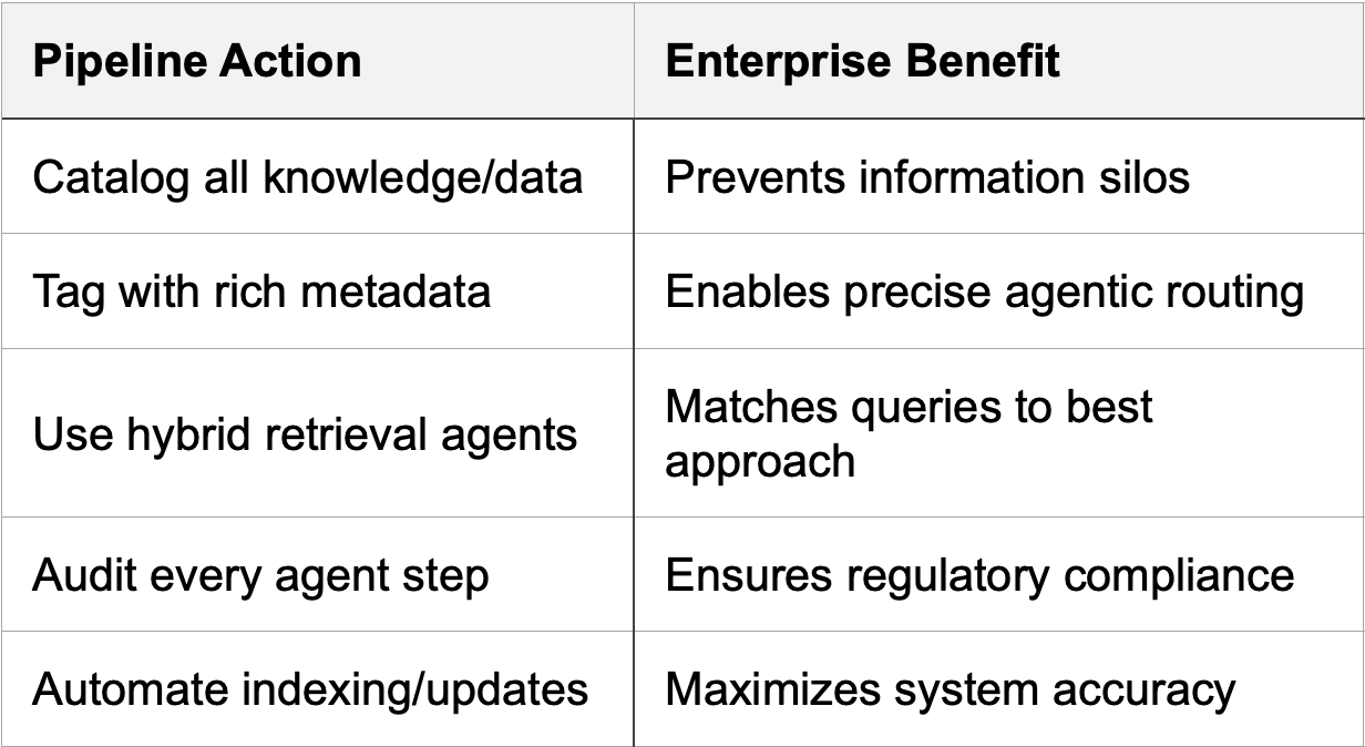 Modern enterprise organizations are the stewards of immense digital knowledge—documents, data, conversations, diagrams, compliance records, customer histories, and more. As this knowledge grows, so does complexity. The old question—should you choose RAG (Retrieval-Augmented Generation) or CAG (Cache-Augmented Generation)—no longer captures what’s needed to deliver speed, accuracy, and business impact. Today, success is about agentic workflows—AI-powered systems that orchestrate every step in your pipeline, blending retrieval, cache, multimodal context, and self-monitoring agents. This guide unpacks how to build the next generation enterprise AI pipeline for leaders and technical teams ready for transformation.