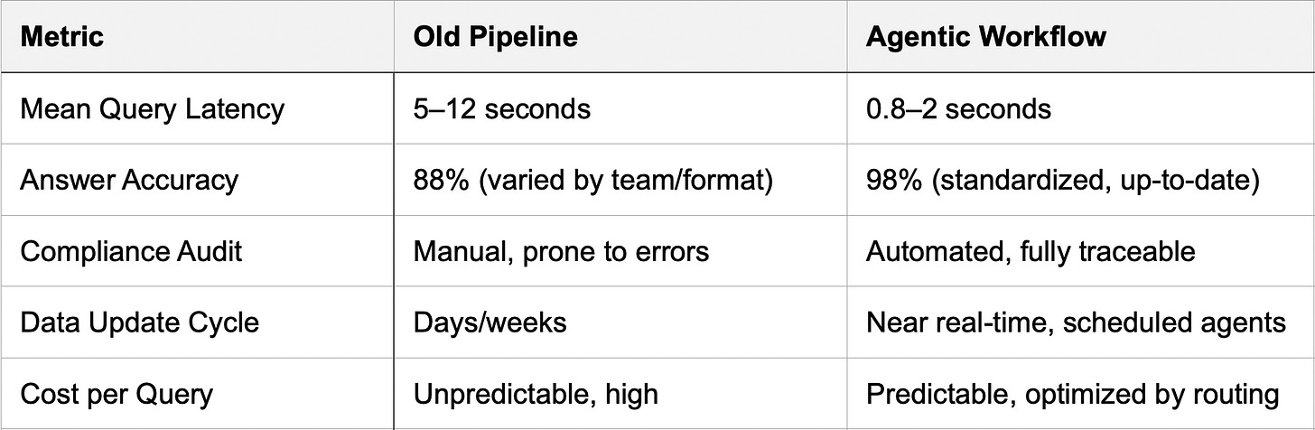 A financial services company routes regulatory queries through dynamic RAG agents. Customer FAQs are handled by CAG. Complex risk modeling uses multimodal agents. The result: answers are faster, more accurate, and every step is logged for external audit, driving confidence across departments and lowering operational expenses.